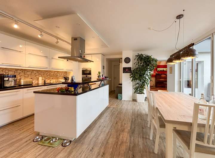 - Offener Küchen-Essbereich mit Blick auf die Terrasse