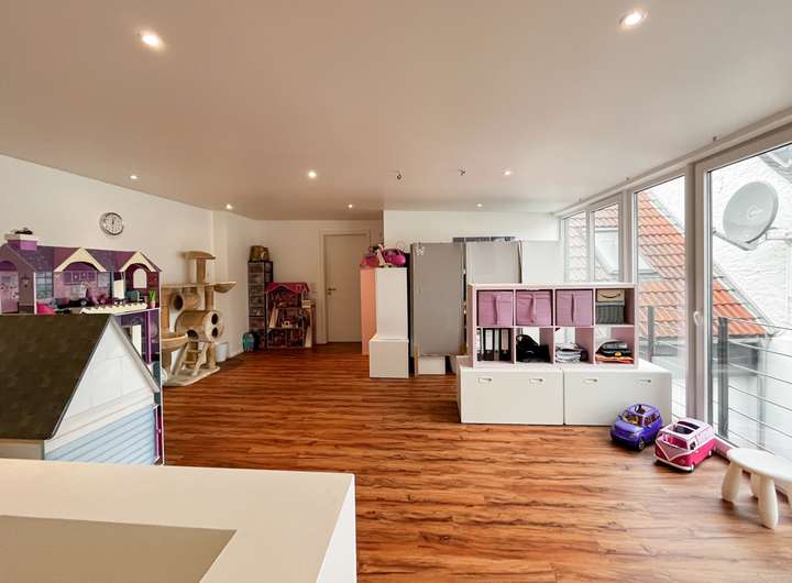Der rechte "Flügel" des Hauses wird aktuell von den Kindern genutzt. Im 1. OG findet sich das Spielzimmer; von hier erreicht man das exklusive Tageslichtbad mit Wanne & Dusche, einen Balkon und die zwei etwa 25 m² großen Kinderzimmer ab.