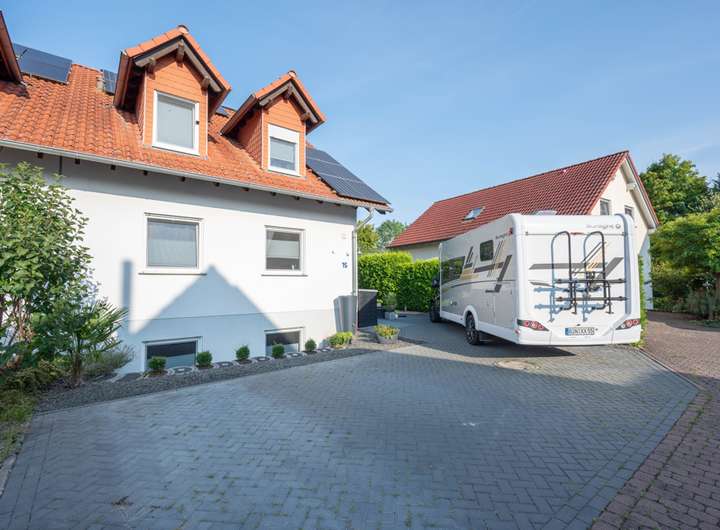 Vor dem Haus befinden sich gleich drei Stellplätze. Für Fahrzeuge gibt es dadurch keinen Engpass. Einer der Plätze eignet sich auch, um ein etwas Wohnmobil direkt am Haus abzustellen. Auch so was ist nur sehr selten zu finden.