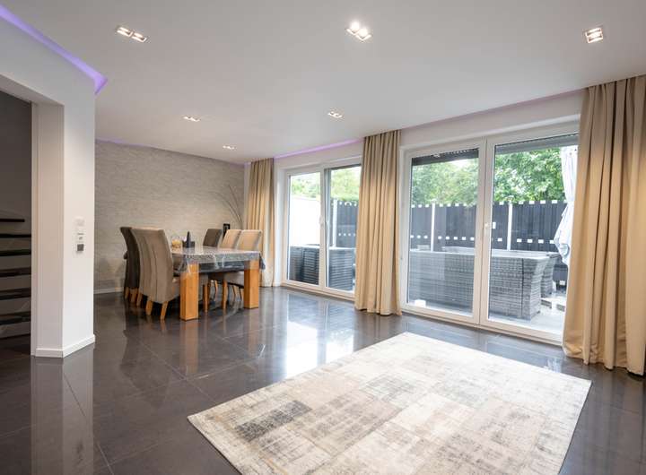 Das Haus hat eine Wohnfläche von stattlichen 182 m². Diese verteilen sich auf drei Etagen. Die Hauptwohnetage bietet Ihnen ein sehr großzügiges Wohn- und Esszimmer mit 37 m² Fläche und mit direktem Ausgang auf die große, geschützt liegende Terrasse. Außerdem haben Sie eine geräumige, 16,5 m² große Küche. Wie das Wohnzimmer ist auch die Küche nach zwei Seiten belichtet, was beide Räume angenehm hell macht.
