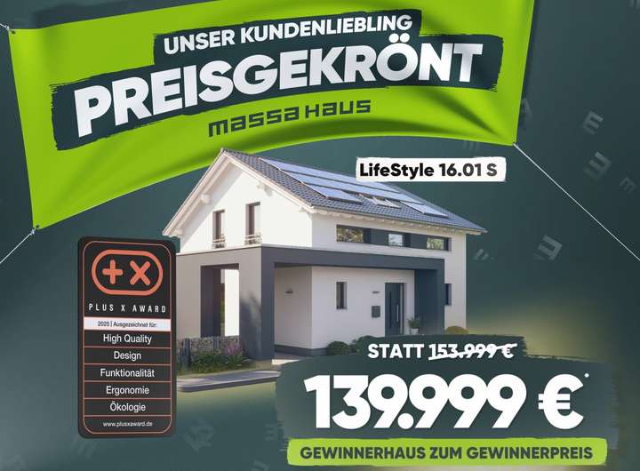 Unser LifeStyle 16.01 S, Preisträger des Plus X Award, ist ein Ort für wundervolle Momente - und mit seinen Standards in Qualität, Design und Nachhaltigkeit ein zukunftsfähiges Zuhause. Auf einer Nettogrundfläche von 162 m² bietet das LifeStyle 16.01 unter seinem Satteldach jede Menge Platz für die persönliche Entfaltung. Das Haus besticht durch seine selbstbewusste Ausstrahlung und ist ideal für Familien mit dem Wunsch nach viel Freiraum. Doch vor allem durch seine individuellen Ausbaumöglichkeiten gewinnt das Haus an schmeichelnder Größe.