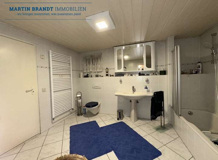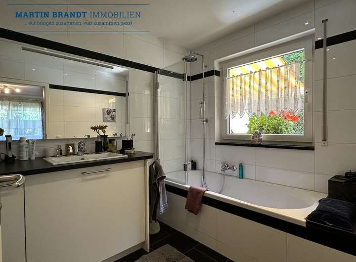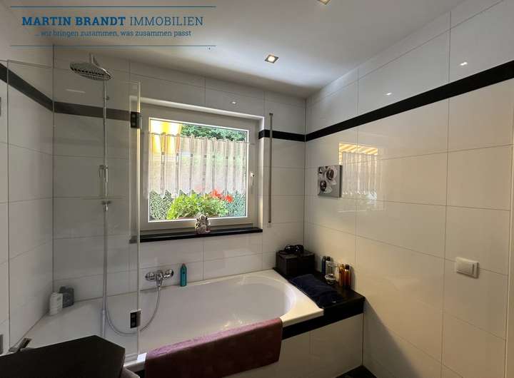 - Badezimmer mit Fenster, Dusche und Wanne, WC, raumhoch gefliest