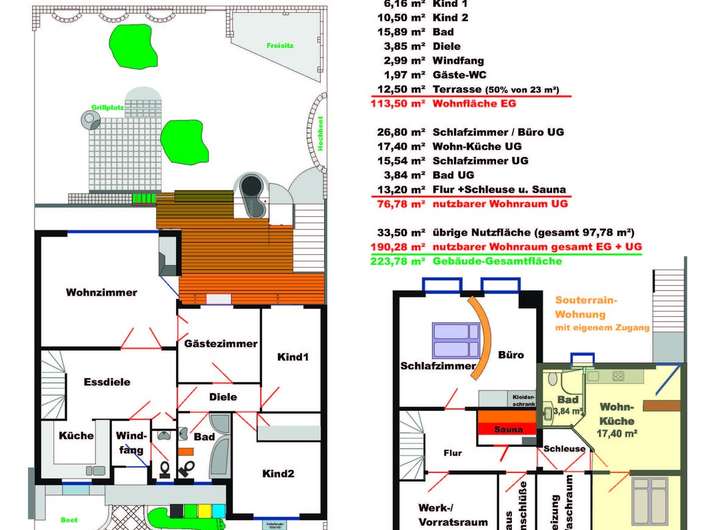 Das Untergeschoss ist über eine Innentreppe sowie einen separaten Gartenzugang erreichbar. Hier stehen weitere ca. 77 m² wohnlich ausgebaute Räume zur Verfügung - darunter ein großzügiger Wohn-/Hobbyraum mit freiem Blick auf den tiefergelegten Grillplatz, ein modernes Bad mit bodengleicher Dusche, eine Küche, ein weiteres Schlafzimmer und sogar eine Sauna. Damit eignet sich dieser Bereich perfekt für Gäste, Homeoffice, Freizeit oder als eigenständige Souterrain Einheit mit eigenem Zugang über den Garten.