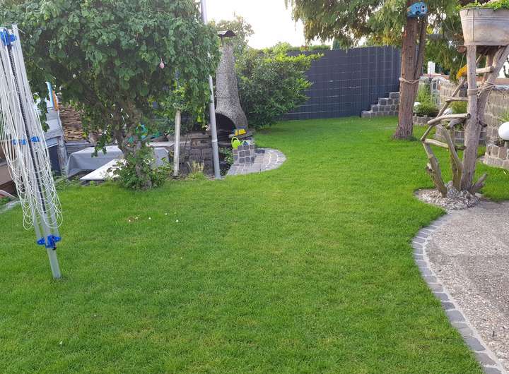 Zum Haus gehört eine Einzelgarage in einer Garagenreihe, die in 15 m Entfernung durch das Gartentor erreichbar ist. Zwei Stellplätze (davon einer mit 22 kW-Wallbox-Anschluss) gehören ebenfalls zum Eigentum. Eine neu angelegte Zuwegung und ein geschützter Garten mit abgesenktem Grillplatz teilen das Grundstück geschickt ein. Die Außenanlagen sind pflegeleicht angelegt und laden dennoch zum Gärtnern (gemauertes Hochbeet) oder Spielen (integrierte Rutsche) ein.