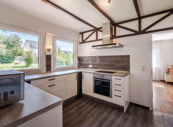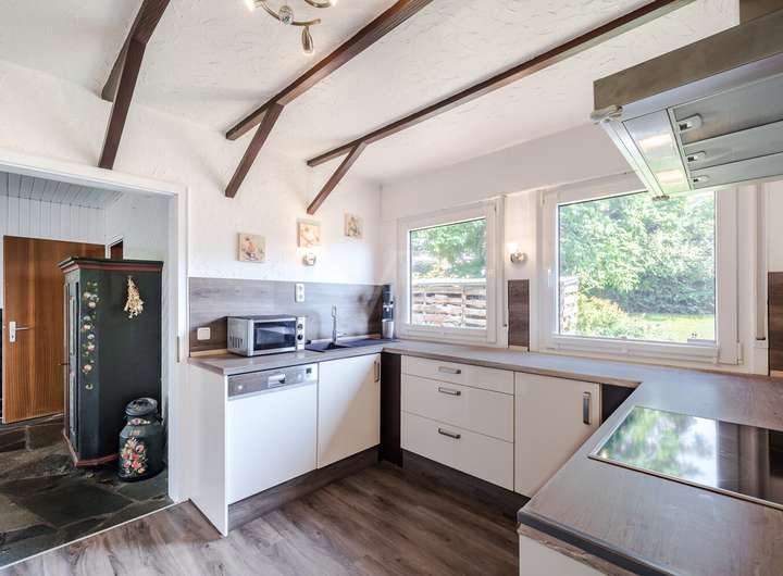Das offen gestaltete Esszimmer ist sowohl vom Wohnbereich als auch von der Küche begehbar. Die helle Einbauküche mit charmanter Balkendecke ist mit Markengeräten ausgestattet und bietet ausreichend Stauraum.