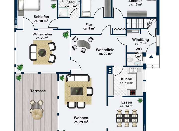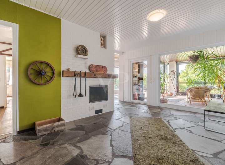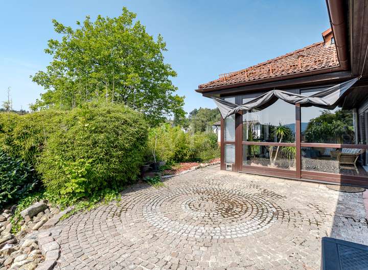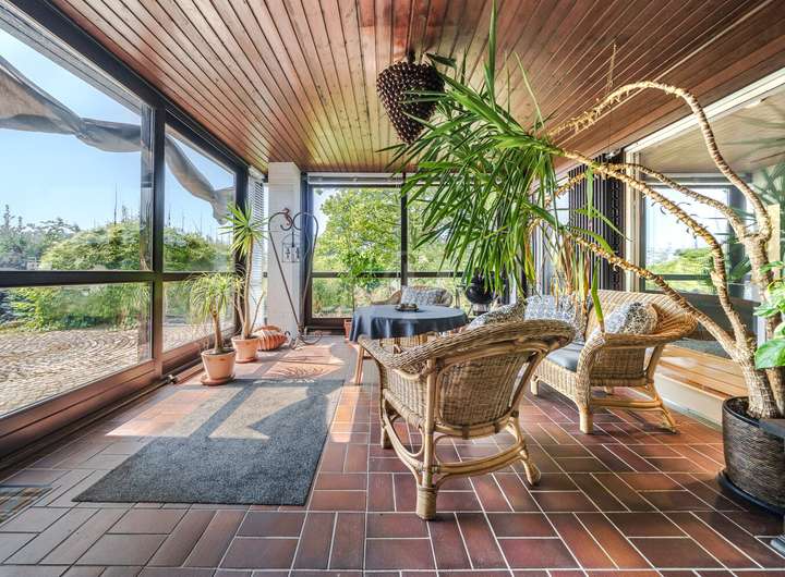 Ergänzt wird dieser Bereich durch einen lichtdurchfluteten Wintergarten, der ebenfalls zum Verweilen in herrlicher Naturkulisse einlädt.