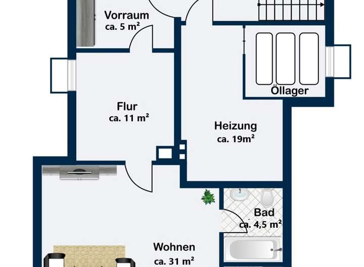 Zusätzlich stehen im Kellergeschoss weitere gut dimensionierte Nutzräumlichkeiten wie Vorratsräume, ein Hauswirtschaftsraum sowie Werkstatt, Heiz- und Tankraum zur Verfügung.