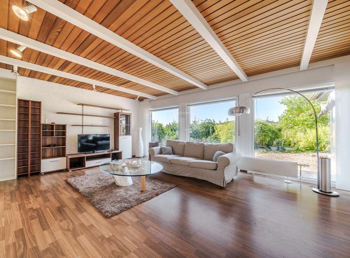 Das angrenzende Wohnzimmer überzeugt durch eine bodentiefe Fensterfront, die nicht nur viel Tageslicht hereinlässt, sondern auch den eindrucksvollen Blick ins Grüne - auf die großzügige Terrasse, den gepflegten Garten und den Taunuswald eröffnet.