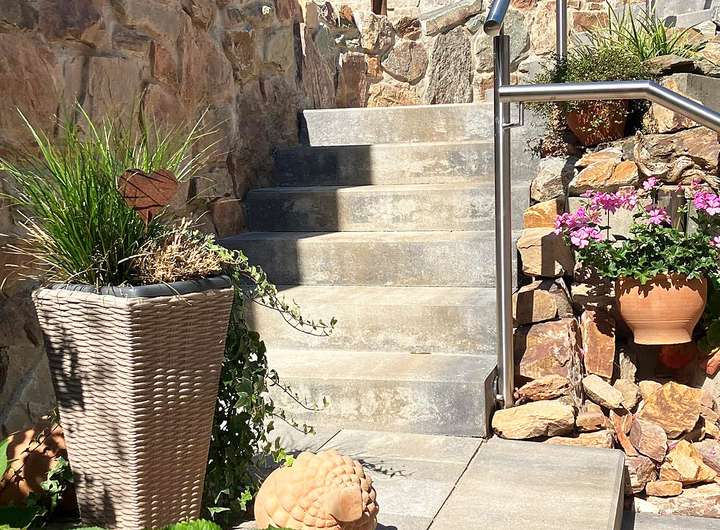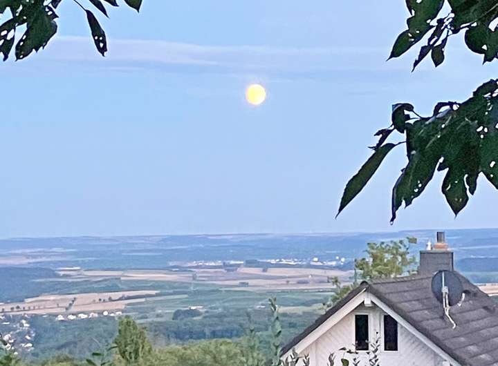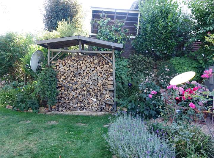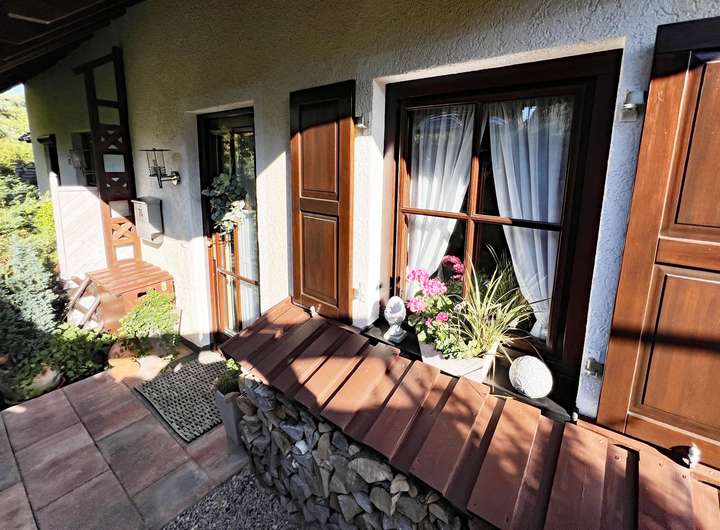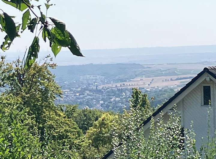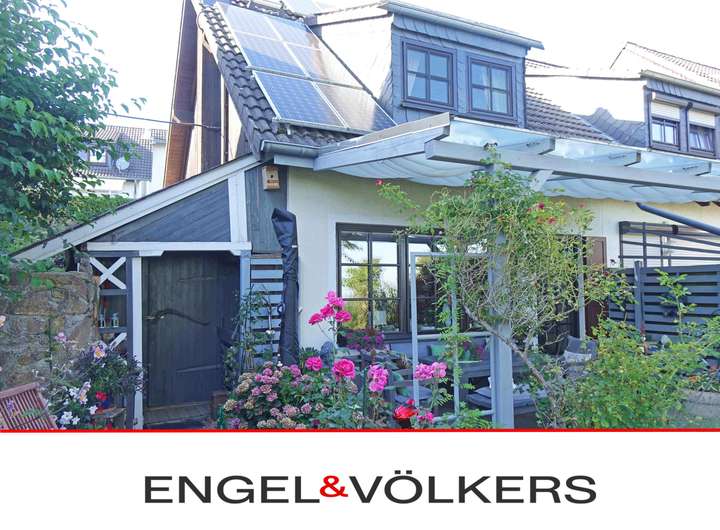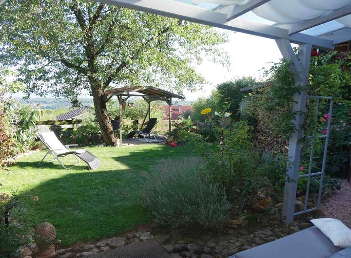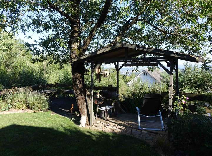 Der komplette Außenbereich ist genauso perfekt gepflegt wie das Hausinnere. Angefangen von der gut begehbaren Treppe zum Haus bis hin zur geschützten Terrasse mit dem hübschen Garten. Ein Teich, ein Gartenhaus sind ebenso Bestandteil des bezaubernden Gartens wie eine weitere Sitzecke unter einem großen Kirschbaum. Aber das ganz besondere Highlight ist die atemberaubende Fernsicht, die bis nach Bad Kreuznach reicht.