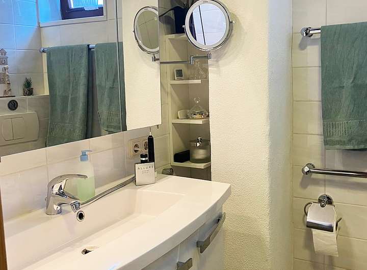 Im OG sind zwei Schlafräume, davon einer mit einem integrierten Bad, der andere dafür mit einer super Fernsicht, sowie ein extra großes Bad vorzufinden. Beide Bäder verfügen über eine bodentiefe Dusche und Tageslicht.