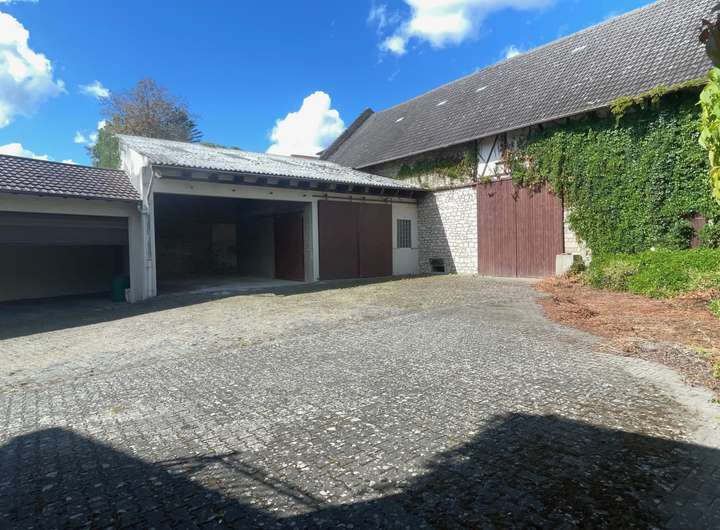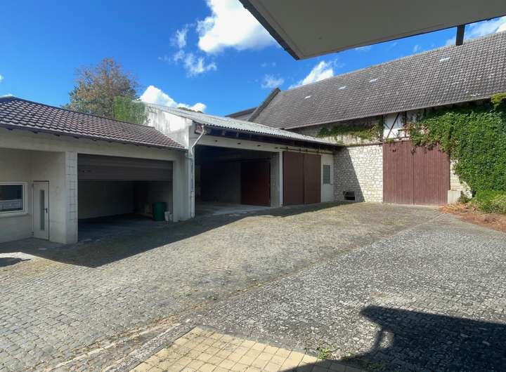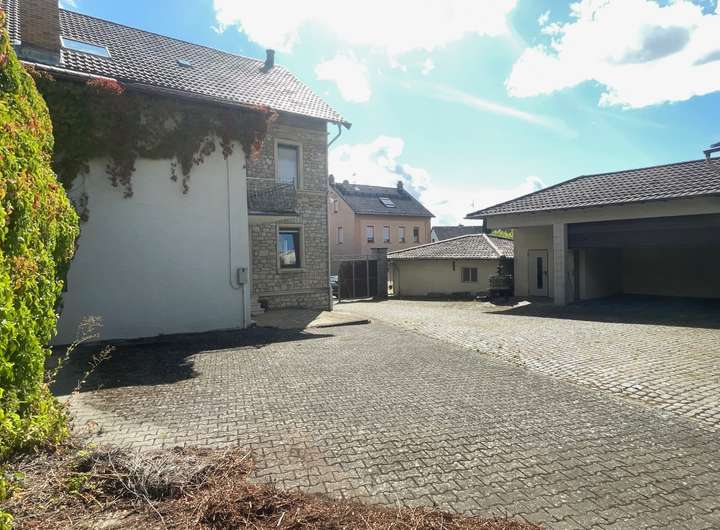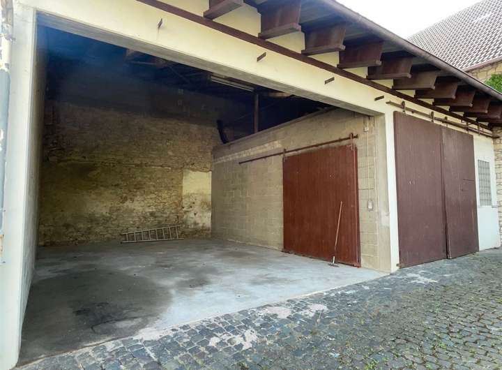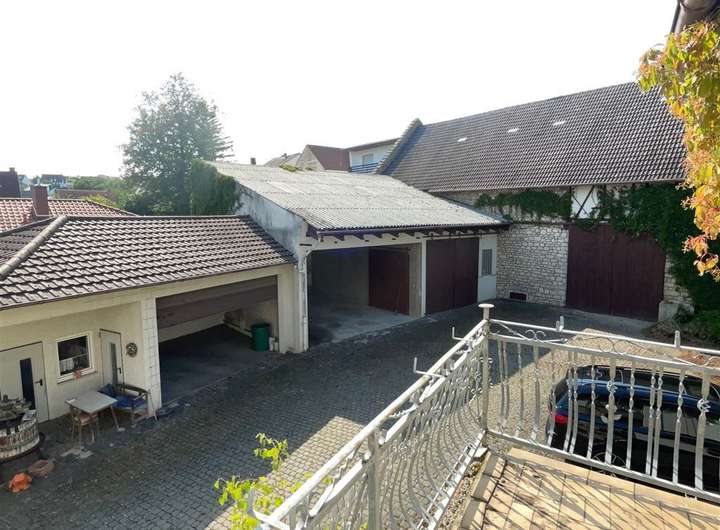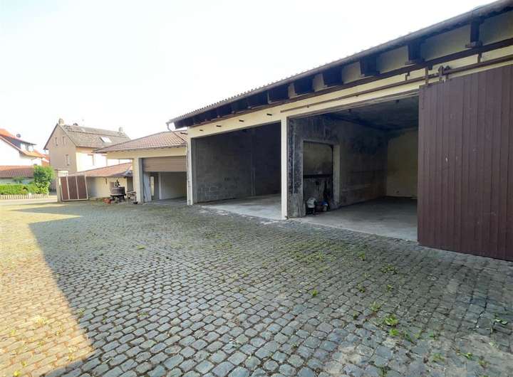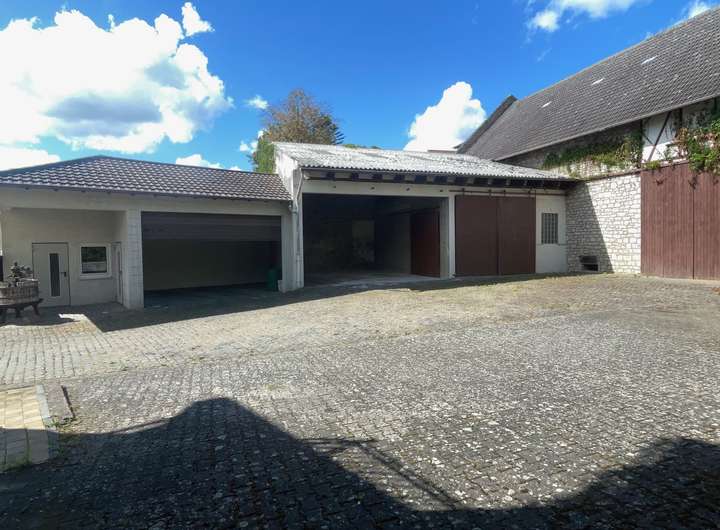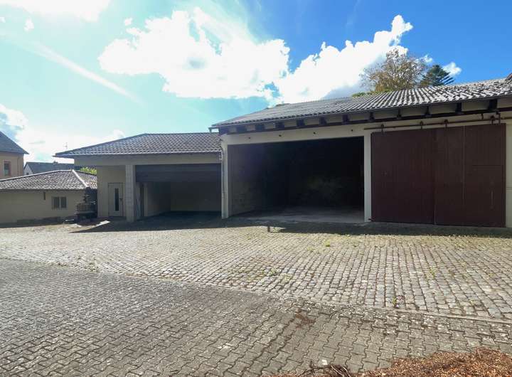 Kleiner Werkstatt, Doppelgarage, offener Car-Port, Geräte-Garage mit Roll-Tor und dem Zugang zum Kelterhaus in der Scheune.