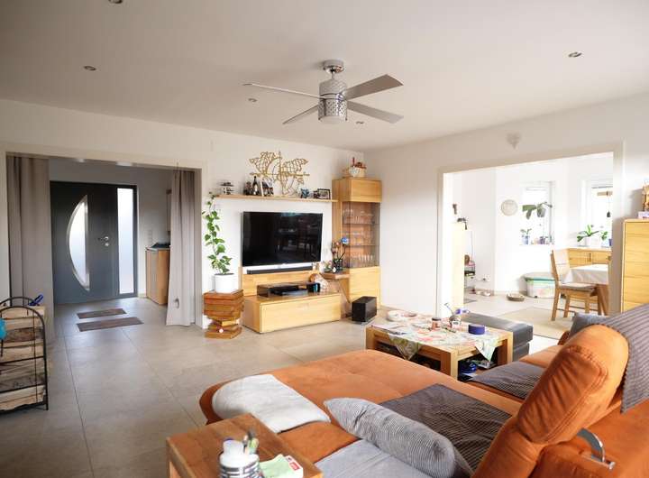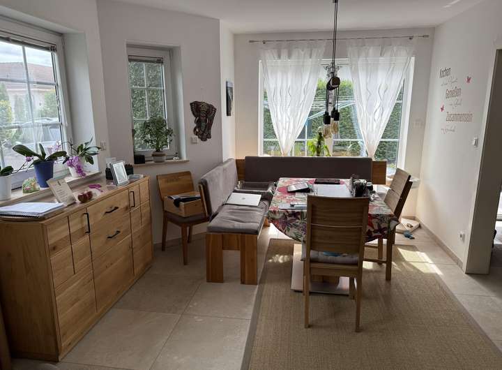 Das sehr große und lichtdurchflutete Wohnzimmer, welches zusätzlich mit einem Holzkamin mit 7,5KW beheizt werden kann, bietet eine wohlige Atmosphäre. Angrenzend befindet sich der Essbereich, der durch eine Glastür von der Küche getrennt ist. Die eingebaute Küche, ist eine Brigitte Küche Model Terra von 2021 ausgestattet mit Miele Geräten welche noch 7Jahre Garantie haben. Die Abluft derAbzugshaube ist mit einer Klimaklappe nach Außen geführt. Die Arbeitsplatte ist aus Granit.