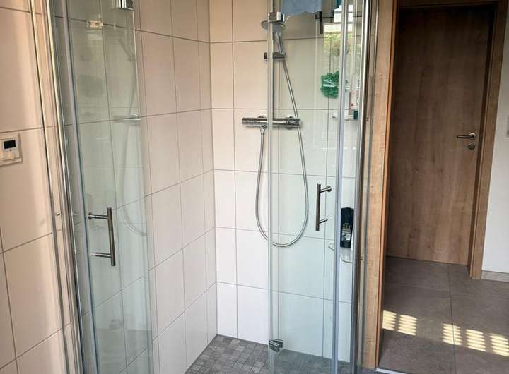 1 Tageslichtbad mit einer barrierefreien Dusche mit faltbarer Doppel-Glas-Duschwand, Handtuchheizkörper und WC.