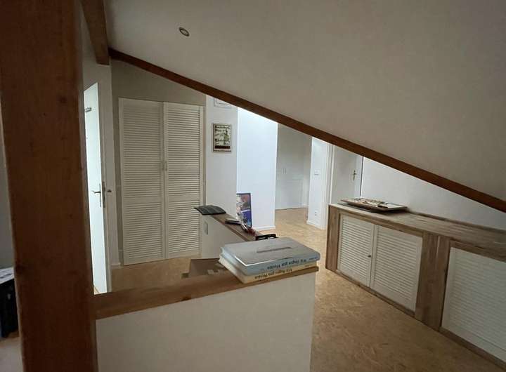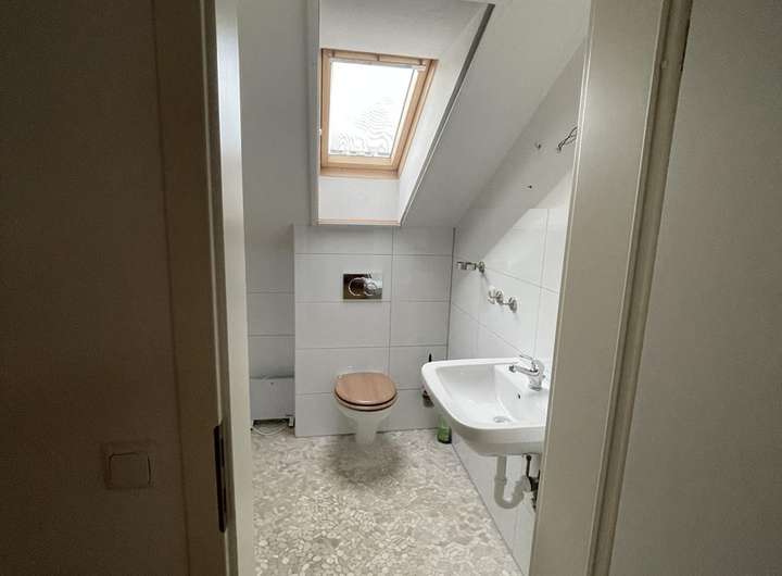 Über die Holztreppe erreichen Sie den Dachgeschossbereich. Hier verfügen sie über 3 Zimmer und ein Tageslicht Duschbad mit WC und Waschbecken.