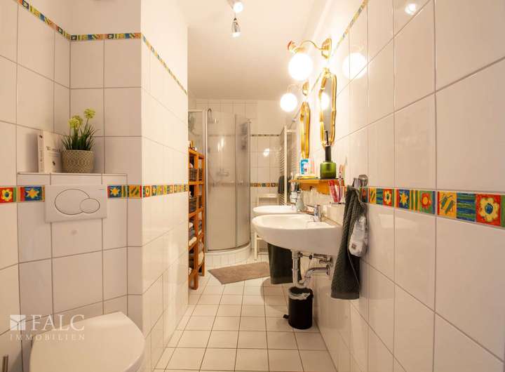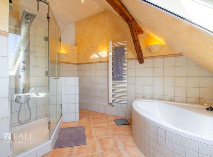 Das offene Badezimmer im Dachgeschoss ist modernisiert und mit hellen Fliesen halbhoch gefliest. Es verfügt über eine Dusche, eine Badewanne, ein Waschbecken und eine Toilette.