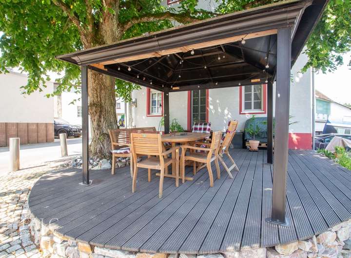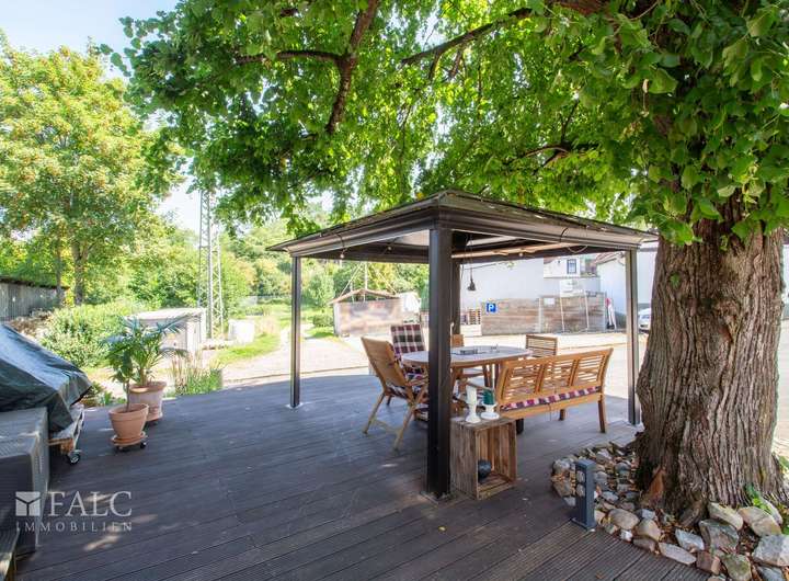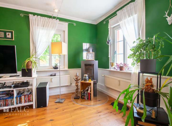 Eine Küche, ein Wirtschaftsraum mit Gäste WC gehören zum Raumprogramm dieser Etage. Das Highlight ist das ca. 37 m² große Wohn- und Esszimmer mit einer offenen Fachwerkwand als Raumteiler und einem Kamin. Dieser sorgt in kühlerer Jahreszeit für die behagliche Wärme und lädt Sie und Ihre Gäste zum Verweilen ein. Die vielen Fenster sorgen für einen hellen und sonnendurchfluteten Wohnbereich. Über einen Terrassenausgang gelangen Sie auf die vorgelagerte Südost Terrasse. Hier befindet sich auch eine große alte Linde, die besonders im Sommer für den nötigen Schatten sorgt.