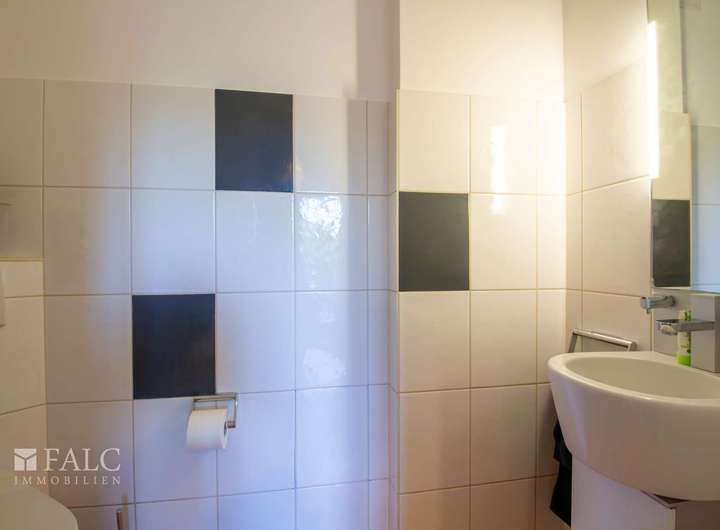 Das Gäste WC ist ebenfalls modernisiert und wurde halbhoch mit hellen Fliesen gefliest.