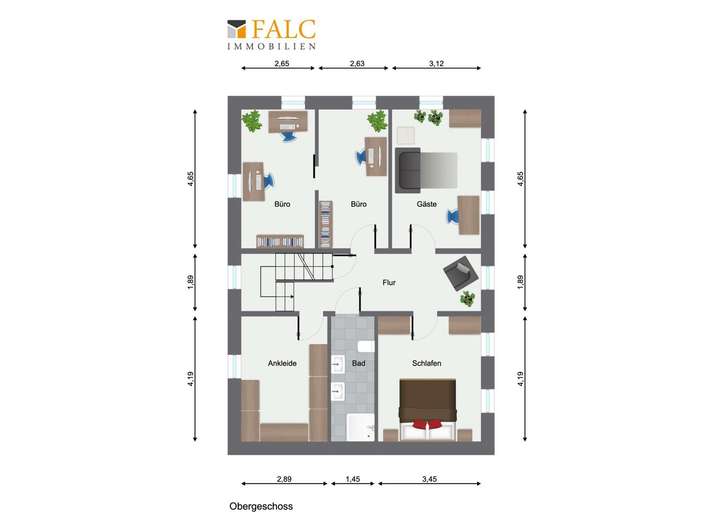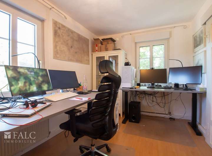 Über eine Treppe in der Diele gelangen Sie in das Obergeschoss. Hier stehen Ihnen ein Schlafzimmer, ein Ankleidezimmer, ein Gästezimmer, zwei Büros und ein Duschbadezimmer zur Verfügung.