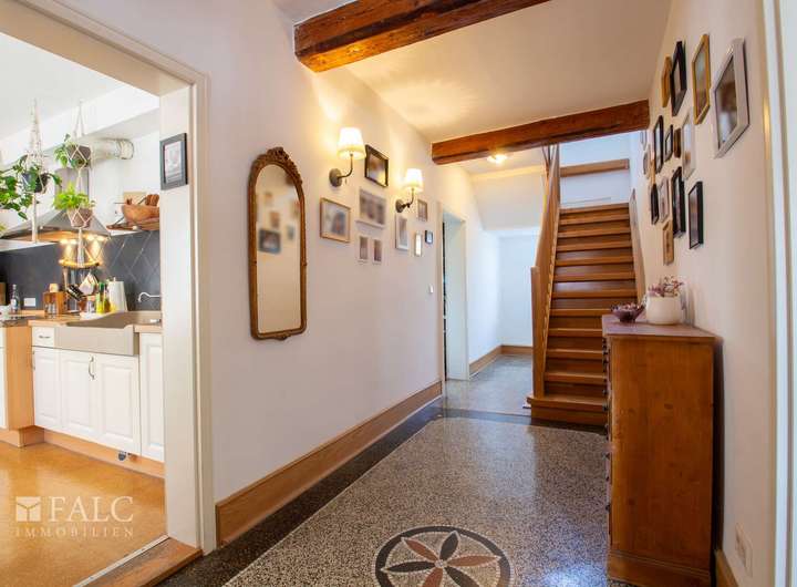 Der Eingangsbereich des historischen Fachwerkhauses ist mit einem Terrazzoboden versehen.