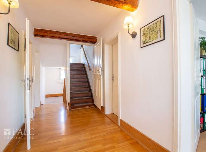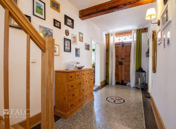 Über eine kleine Eingangstreppe betreten Sie das Haus und gehen durch eine historische Eingangstür. Hier werden Sie in der geräumigen mit einem Terrazzoboden ausgestatteten Diele empfangen. Von hier aus gelangen Sie zu allen Räumen des Erdgeschosses.