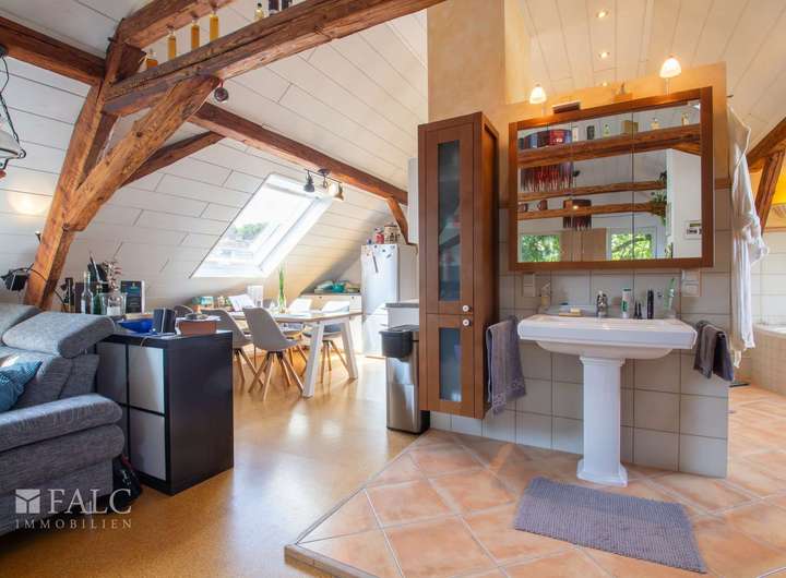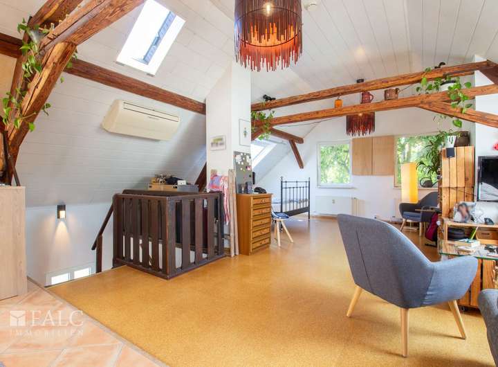 Ein weiteres Highlight des Hauses ist das im Dachgeschoss befindliche ca. 64 m² große Studio. Das Studio wird als multifunktioneller Raum genutzt und bietet eine Küchenzeile, ein offenes Badezimmer mit Badewanne und Dusche, eine Ankleide sowie genügend Platz für einen Schlaf- und Wohnbereich.