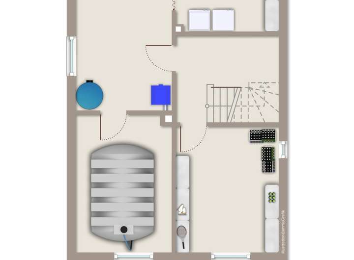 - Keller mit Vorratsraum, Waschküche, Heizungskeller und Tankraum, der Wintergarten und das Wohnzimmer sind nicht unterkellert,