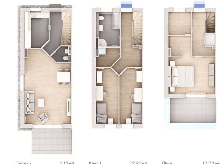 Im Erdgeschoss erwartet Sie ein offener Wohn- und Essbereich mit direktem Zugang zur Terrasse, eine separate Küche, eine einladende Diele sowie ein Gäste-WC. Das Obergeschoss bietet mit zwei hellen Kinderzimmern, einem modernen Bad, Flur und Hauswirtschaftsraum viel Platz für die ganze Familie. Im Dachgeschoss finden Sie Ihr privates Refugium: ein großzügiges Elternschlafzimmer mit eigener Ankleide, Abstellraum, Flur und einer traumhaften Dachterrasse, die direkt vom Schlafzimmer aus begehbar ist – ein Rückzugsort zum Entspannen über den Dächern von Bischofsheim.
