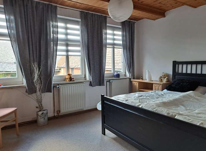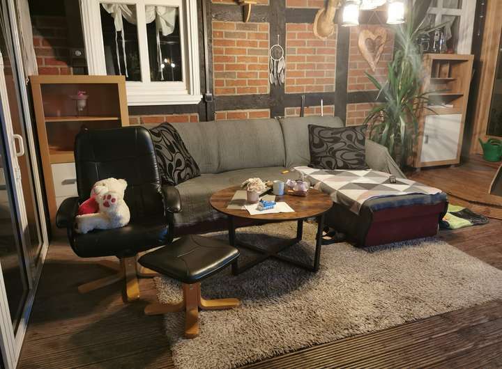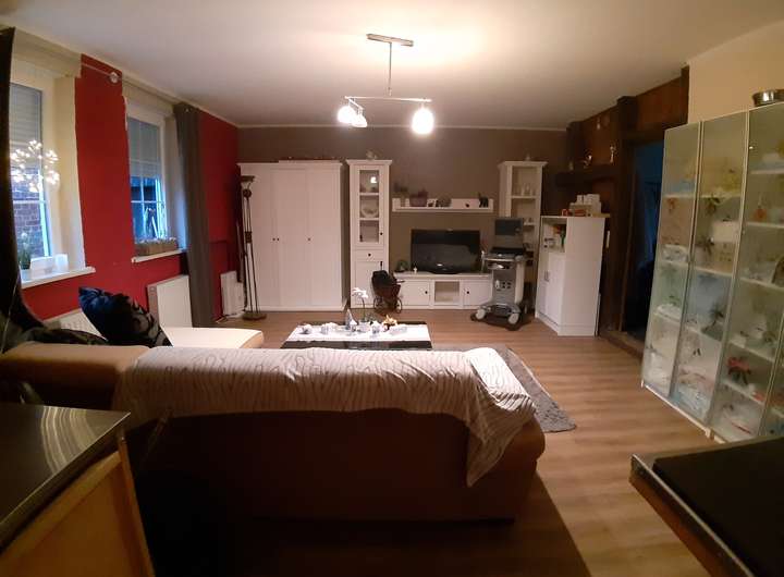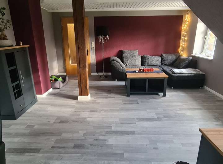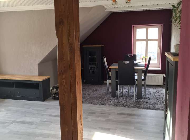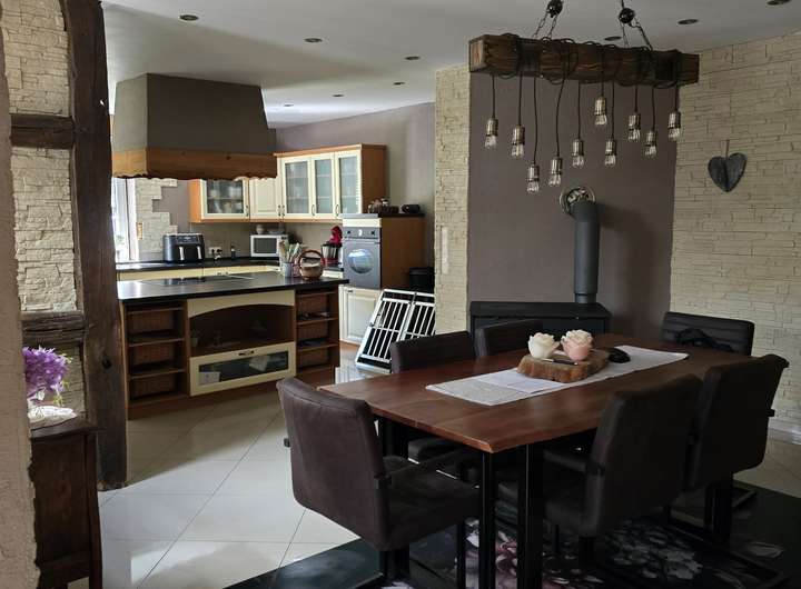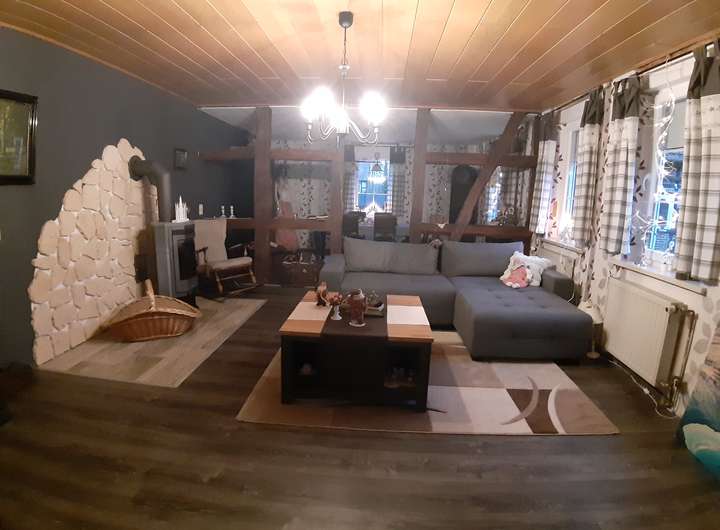 Von hier gelangen Sie in das Wohnzimmer mit seinen harmonisch abgestimmten Landhausdielen und einen Kaminofen. Teilweise ist an den Wänden das Fachwerk zu sehen.
