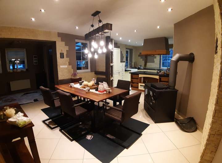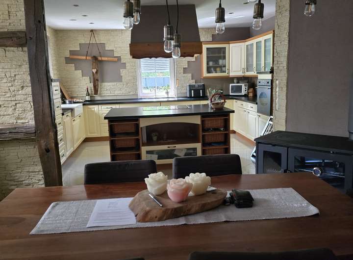 Der offen gestaltete Küchen-/Essbereich mit Zugang in den Wintergarten (mit Kaminofen) kann Ihr zentraler Lebensmittelpunkt des Hauses werden. Hier verschmelzen Kochen, Entspannen und gemütliches Beisammensein zu einem harmonischen Ganzen. Eine stilvolle Küchenhexe sorgt für eine gemütliche Atmosphäre.