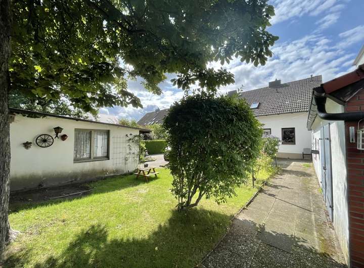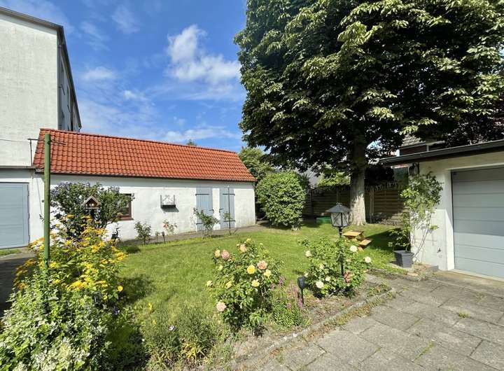 Das rund 600 Quadratmeter große Grundstück rundet das attraktive Angebot ab: Im hinteren Bereich befindet sich ein großzügiger, gepflasterter Hof mit zwei Garagen. Der angrenzende Garten lädt zum Entspannen ein, zwei Terrassen bieten gemütliche Rückzugsorte. Ein Nebengebäude im Stil des Hauptgebäudes auf dem Grundstück eröffnet zusätzliche Nutzungsmöglichkeiten – ob als Atelier, Home-Office, Gästehaus oder Spielraum für Kinder.