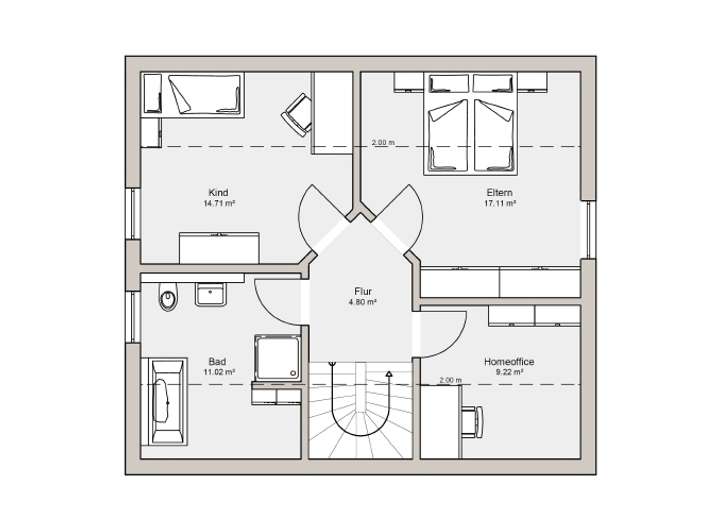 Das praktisch aufgeteilte Dachgeschoss bietet zwei Schlafräume, ein Familienbadezimmer und ein zusätzliches Home-Office.