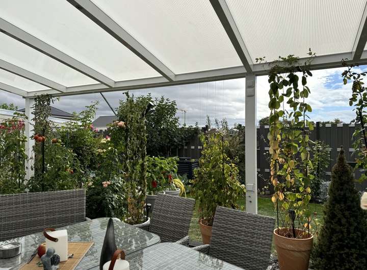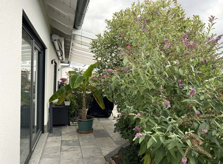 Die Terrasse lädt zum Verweilen ein und eröffnet den Blick auf die umliegenden Felder. Hier genießen Sie sonnige Stunden im Grünen und zugleich die Ruhe einer gewachsenen Umgebung. Dank der durchdachten Lage verbinden sich ländliche Idylle und die Nähe zu allen wichtigen Verbindungen in Rheinhessen.