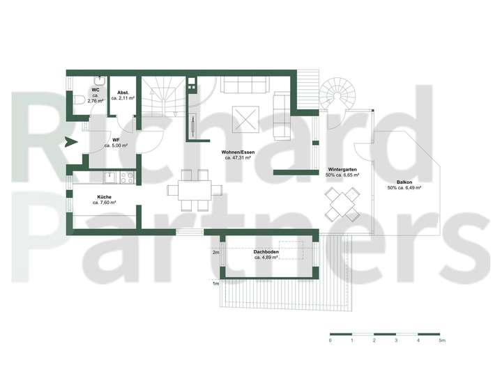 Der Eingangsbereich empfängt Sie mit einer praktischen Garderobe und führt direkt zu einem tageslichtdurchfluteten Gäste-WC mit Dusche. Eine Abstellkammer bietet zusätzlichen Stauraum. Durch eine stilvolle, verdunkelte Glastür gelangen Sie ins Treppenhaus und weiter in den offenen Bereich von Küche, Esszimmer und Wohnzimmer. Zunächst erwartet Sie auf der rechten Seite eine helle, moderne Einbauküche mit hochwertiger, schwarzer Arbeitsplatte, die maßgefertigt wurde und im Haus verbleibt. Der angrenzende Ess- und Wohnbereich wird durch den lichtdurchfluteten Wintergarten bereichert, der einen wunderbaren Blick ins Grüne bietet und direkt Zugang zum Balkon gewährt. Der mediterrane Kamin im Wohnzimmer sorgt für wohlige Wärme und eine gemütliche Atmosphäre. Eine Wendetreppe führt Sie direkt in den Garten, wo Sie den Außenbereich in vollen Zügen genießen können.