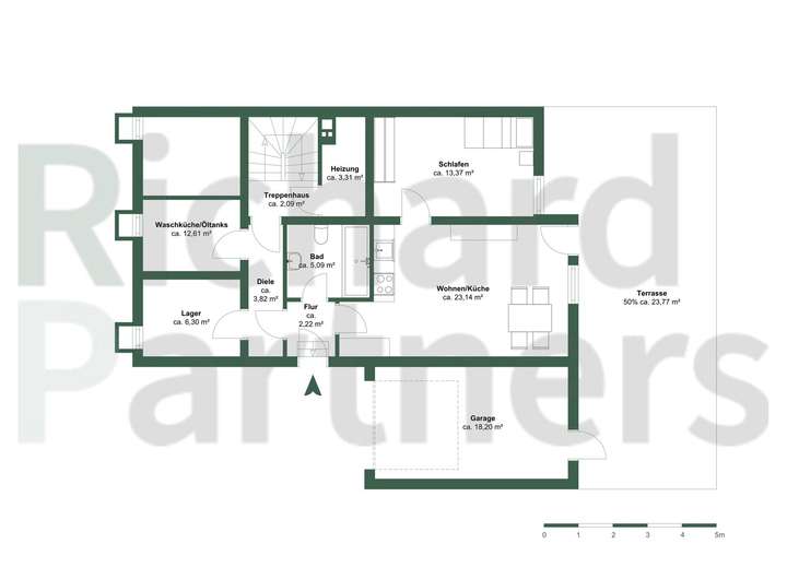 Das Untergeschoss verfügt über einen Flur, der zu mehreren Räumen führt. Zunächst erreichen Sie den Heizungsraum. Weiterhin finden Sie eine separate Waschküche sowie einen Lagerraum, die zusätzlichen Stauraum bieten. Die Öltanks sind in einem eigenen, separaten Raum untergebracht.