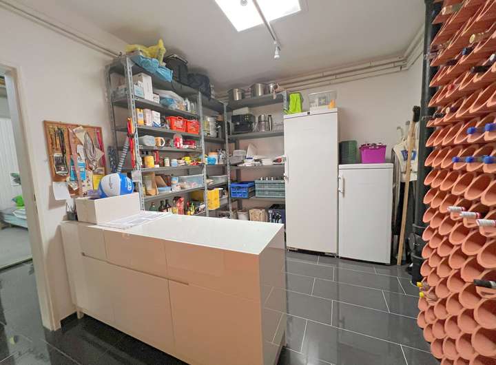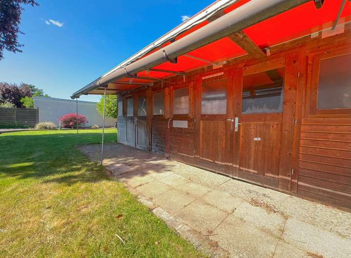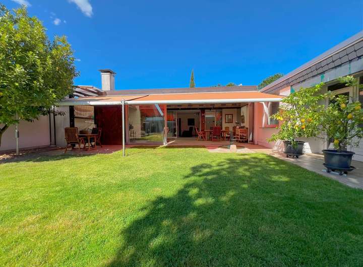 Zwei Außenterrassen mit Markisen laden zum Verweilen im Freien ein – insbesondere im nicht einsehbaren Garten auf der Rückseite des Hauses, der Ruhe und Privatsphäre garantiert. Ein zusätzlicher großer Werkschuppen im Garten bietet praktischen Stauraum.
