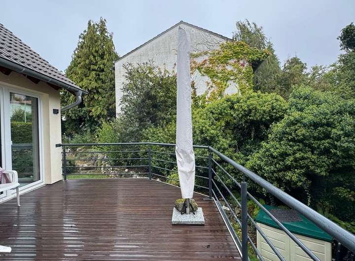 Das moderne und gepflegte Einfamilienhaus wird im Erdgeschoss über eine geräumige Diele mit Gäste-WC und Garderobenbereich betreten. Von hier gelangen Sie in die einseitig offen gestaltete Küche - mit moderner Einbauküche - den großen Wohn-/ Essbereich mit Kaminofen und den angrenzenden Wintergarten. Der Wintergarten sowie die darunter liegenden Zimmer wurden im Jahr 2014 neu errichtet. Vom Wintergarten gelangen Sie auf die umlaufende Sonnenterrasse sowie in den herrlich angelegten Garten.