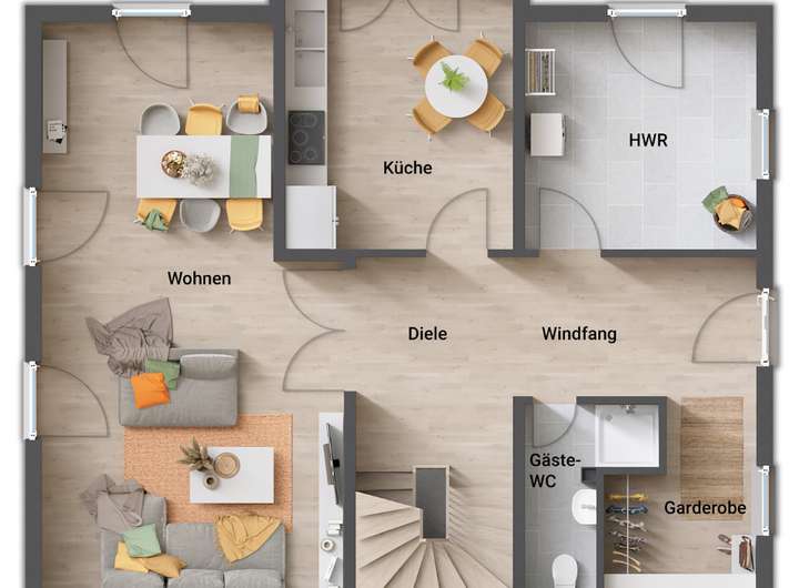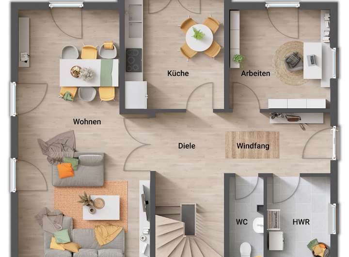 Ihr Haus wird schlüsselfertig übergeben, d.h. Sie gestalten nur noch die Innenwände in Ihrer Lieblingsfarbe und verlegen die übrigen Bodenbeläge!