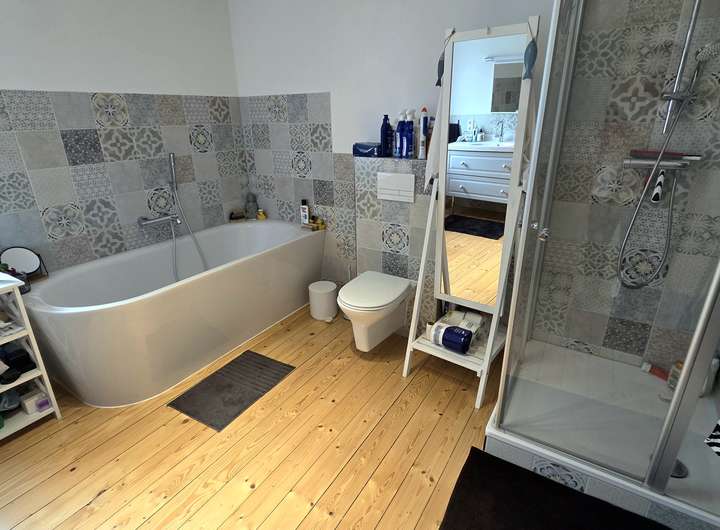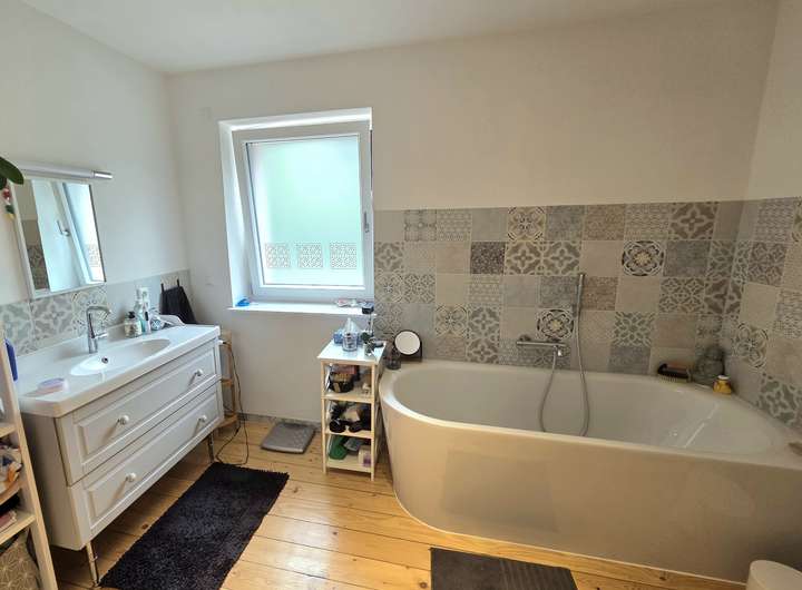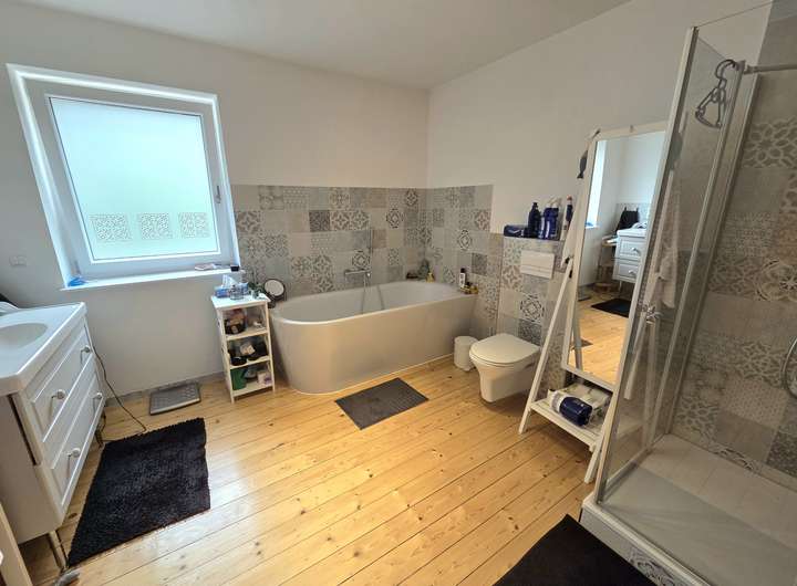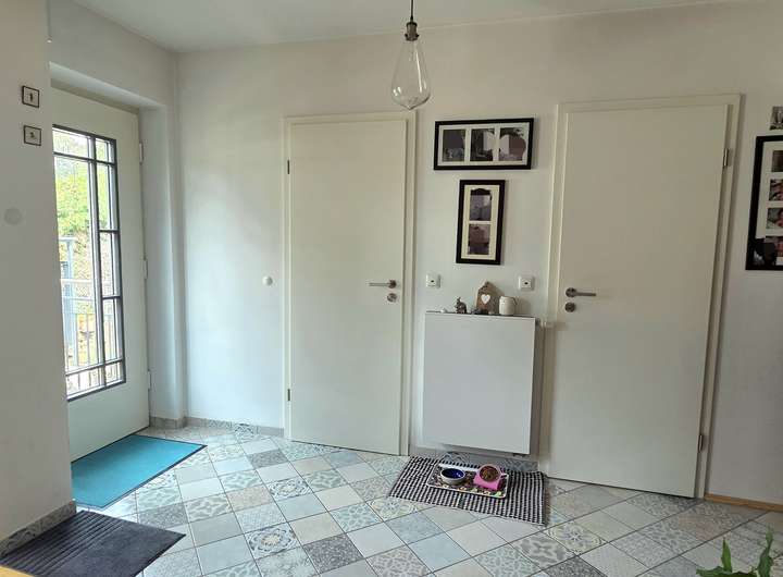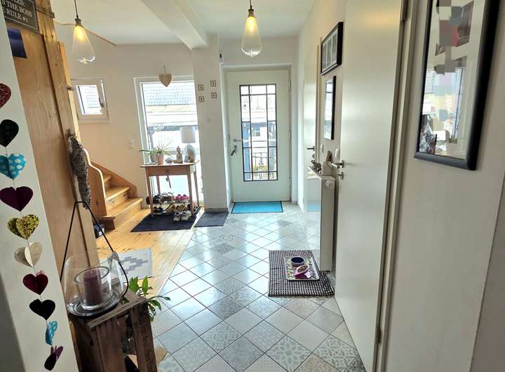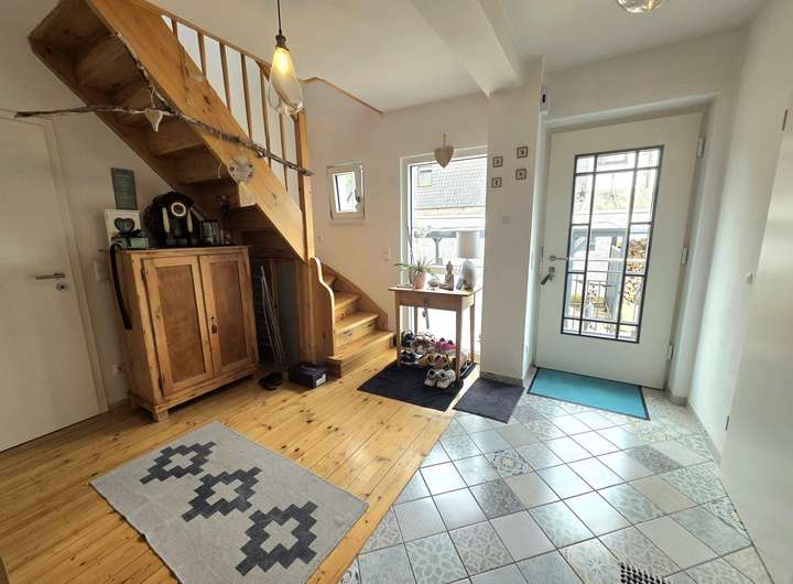 Das Erdgeschoss dieser charmanten Liegenschaft verfügt über eine helle und großzügige Diele mit Garderobe, eine Kombination aus einem Wohn-/Essbereich, verbunden mit einer offenen Küche, und ein abgeschlossenes Zimmer mit Zugang zum Tageslichtbad mit Dusche und Wanne. Ein saniertes, separates WC und ein Abstellraum mit Waschmaschinenanschluss und Fenster befinden sich ebenfalls auf dieser komfortablen Ebene.