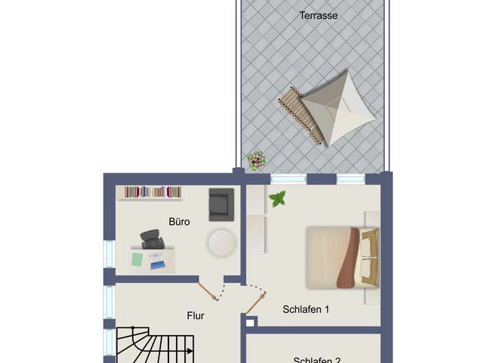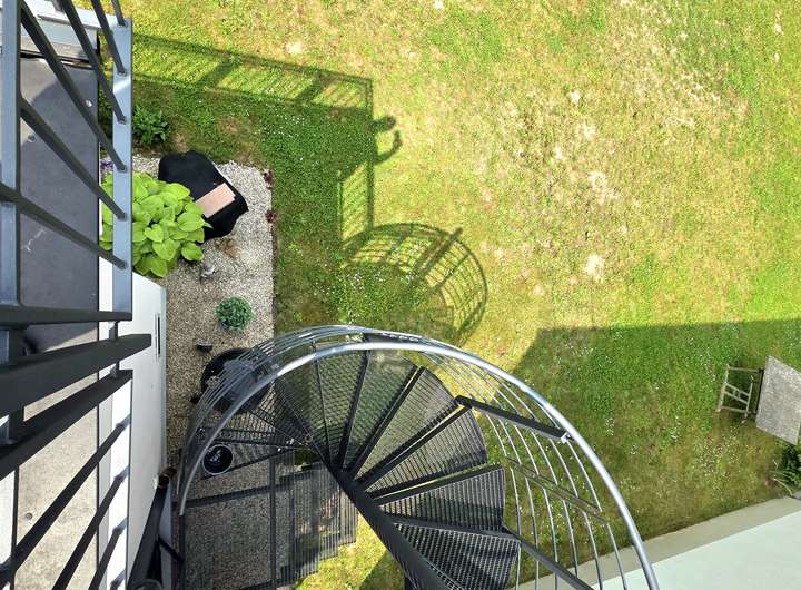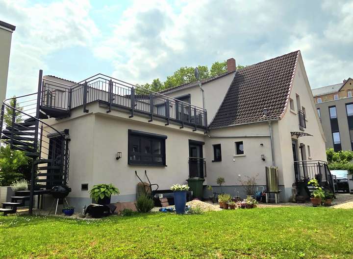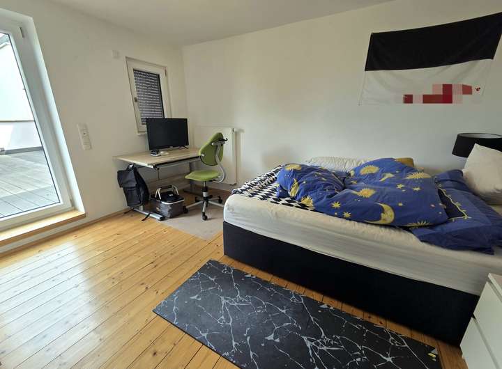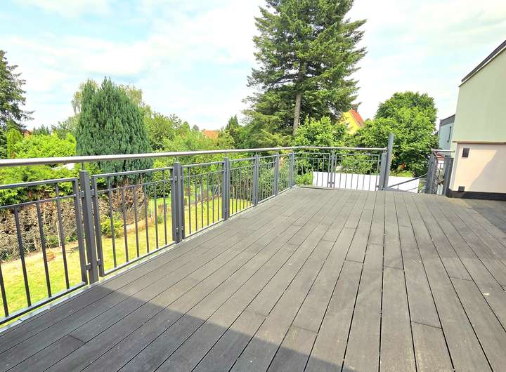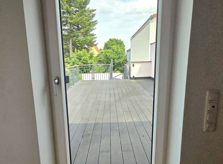 Aus einem der Schlafräume lässt sich die schöne und großzügige Dachterrasse wunderbar betreten. Dieser Bereich ist in dieser Form erst im Jahr 2020 entstanden und kann zudem auch über eine neu errichtete Außentreppe erreicht werden.