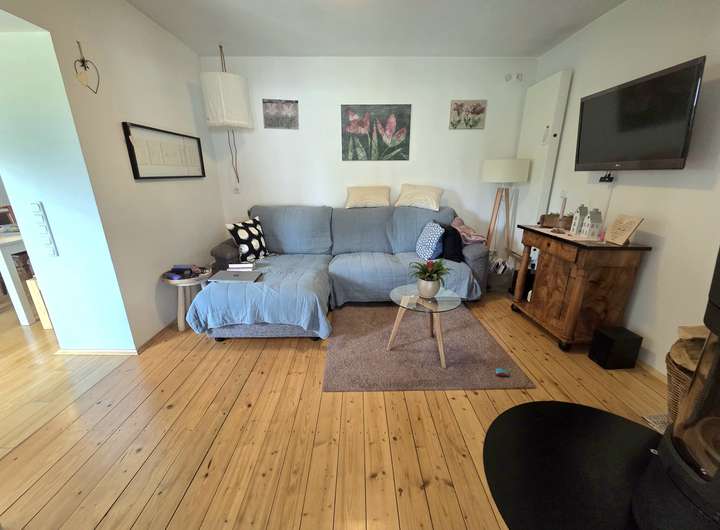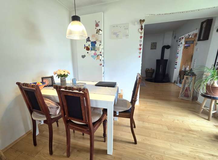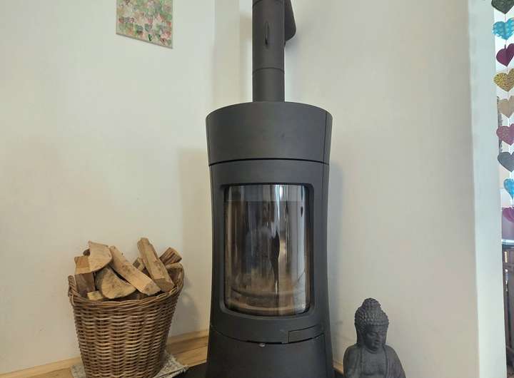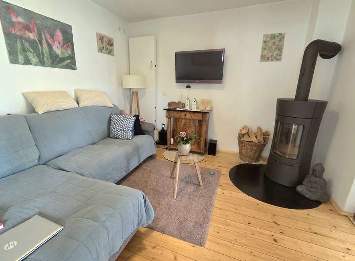 Der nachträglich installierte Kaminofen sorgt gerade an den kälteren Tagen für eine angenehme Wohnatmosphäre und dient gleichzeitig als natürliche Heizquelle.