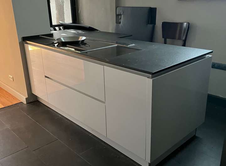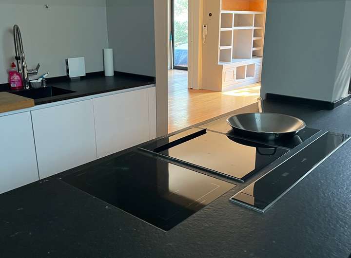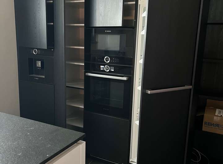 Hochwertige Einbaugeräte ( WokKochfeld, Tepanyiaki Grill,Kochfeld, versenkbarer Dunstabzug, große Eiswürfelmaschine und großem Kühlschrank, die Einbau Kaffeemaschine, Backofen, Mikrowelle und Geschirrspüler sind WiFi steuerbar.