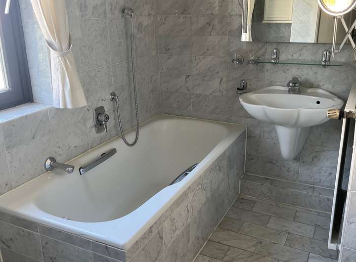 Neben dem mit hellem Marmor gefliesten Vollbad mit Dusche, Badewanne und Fenster gibt es ein separates Gäste WC.