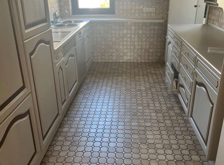 Im Erdgeschoss sind der Eingangsbereich, Flur und Küche in 2017 neu mit großen dunkelgrauen Steinplatten ausgestattet. Hier ist ein komplett neuer Bodenaufbau mit Balken und Isolation erfolgt. Die Bäder sind gefliest.