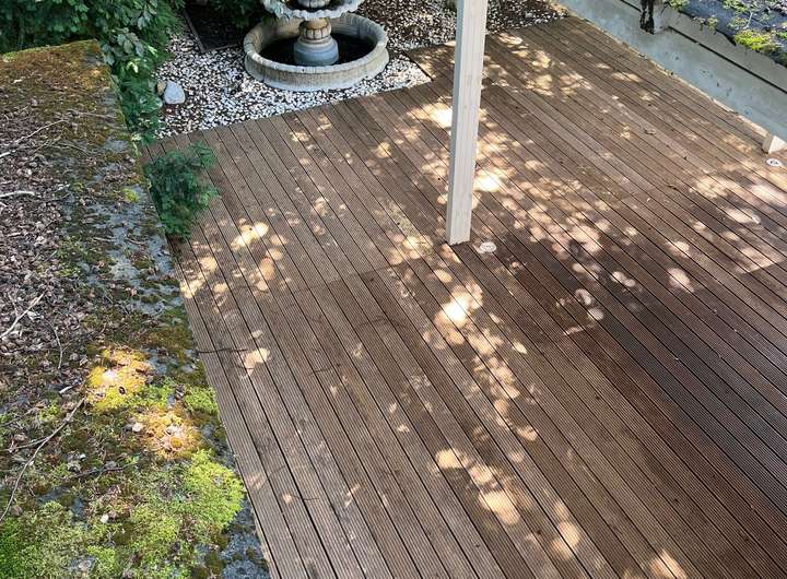 Der vordere Garten ist liebevoll mit viel Teakholz ausgestattet. Zwei große Flügeltüren erlauben den Austritt vom Wohnzimmer direkt in den überdachten Loungebereich.