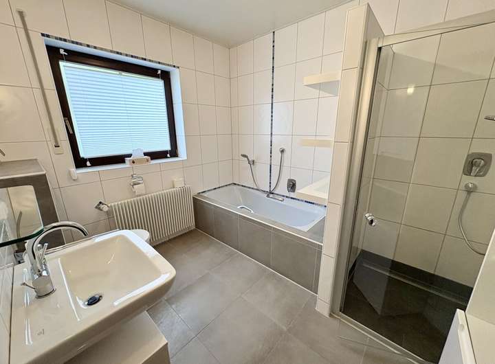 Genießen Sie sonnige Stunden auf der Terrasse oder dem großzügigen Balkon, von dem aus Sie einen wunderbaren Blick auf die romantische Burgruine genießen können. Die hochwertige Marmorfliese in der Diele verleiht dem Eingangsbereich ein elegantes Flair.