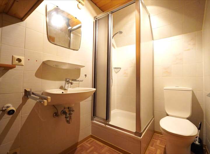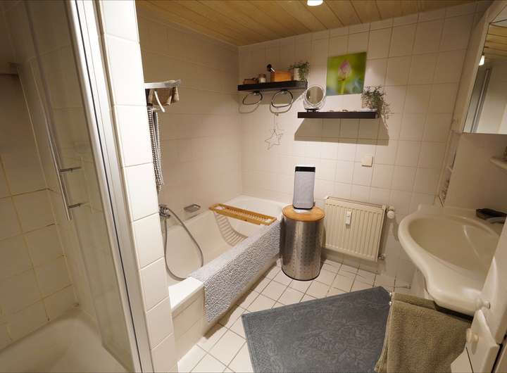 Das Badezimmer ist mit Dusche und Wanne ausgestattet. Zudem gehören eine Terrasse für entspannte Stunden im Freien sowie ein praktischer Außenstellplatz zum Haus.
