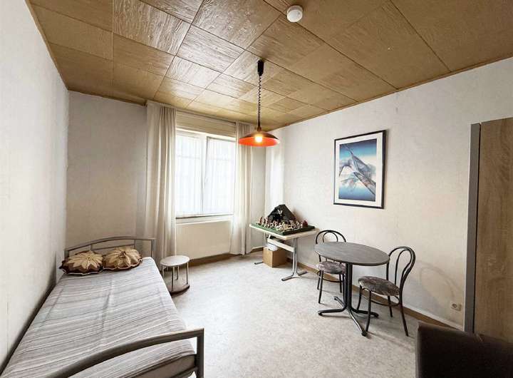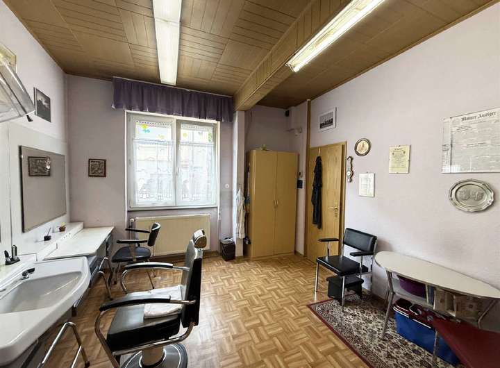 großes Wohnzimmer mit Essbereich, Zimmer (ehemaliger Friseursalon), Flur und