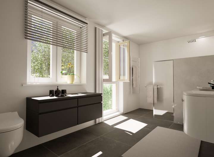 - Hochwertige Badezimmerausstattung mit freistehenden Badewannen, edlen Waschbecken und WCs sowie schwarzen Armaturen von Villeroy & Boch