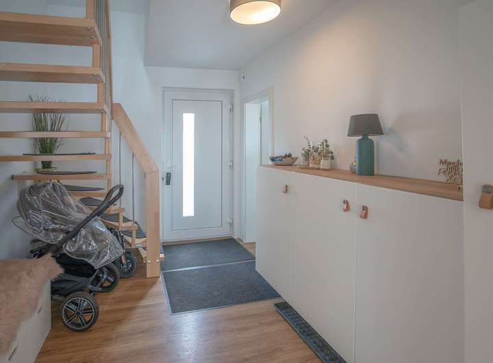 Die hochwertigen Vinylböden sorgen für ein modernes, pflegeleichtes Wohnambiente. Vier PKW-Stellplätze bieten komfortable Parkmöglichkeiten direkt am Haus.
