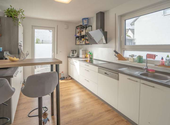 Der helle Wohn-/Essbereich mit direktem Zugang zur sonnigen Süd-West-Terrasse und dem gepflegten, ebenfalls Süd-West-ausgerichteten Garten bildet das Herzstück des Hauses. Die moderne Einbauküche mit Tresen lädt zum gemeinsamen Kochen und Genießen ein. Ein separater Hauswirtschaftsraum mit Waschmaschine und Kühlschrank sorgt ebenso für Ordnung wie eine zusätzliche Abstellkammer. Abgerundet wird diese Ebene durch ein Gästebad mit Dusche.